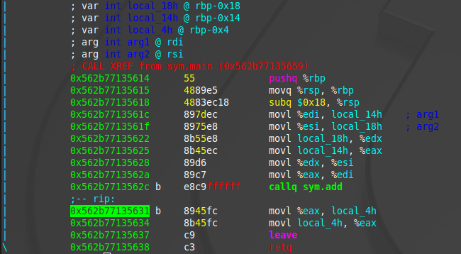 The add function is invoked using the call operand in assembly, in this case callq sym.add. The call operand can either take a label as an argument(e.g. A function name), or it can take a memory address as an offset to the location of the start of the function in the form of call *value. Once the add function is invoked(and after it is completed), the program would need to know what point to continue in the program. To do this, the computer pushes the address of the next instruction onto the stack, in this case the address of the instruction on the line that contains movl %eax, local_4h. After this, the program would allocate a stack frame for the new function, change the current instruction pointer to the first instruction in the function, change the stack pointer(rsp) to the top of the stack, and change the frame pointer(rbp) to point to the start of the new frame.