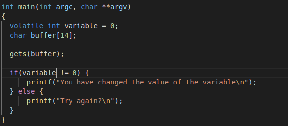 Now that we’ve looked at all the background information, let’s explore how the overflows actually work. If you take a look at the overflow-1 folder, you’ll notice some C code with a binary program. Your goal is to change the value of the integer variable.