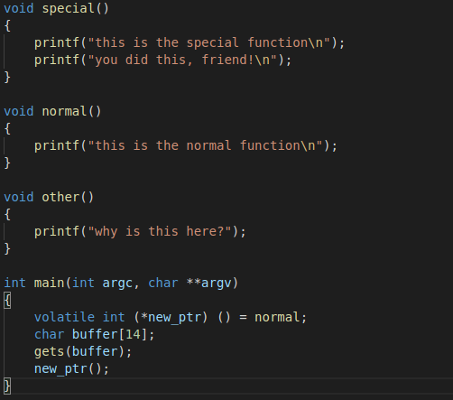 Similar to the example above, data is read into a buffer using the gets function, but the variable above the buffer is not a pointer to a function. A pointer, like its name implies, is used to point to a memory location, and in this case the memory location is that of the normal function. The stack is laid out similar to the example above, but this time you have to find a way of invoking the special function(maybe using the memory address of the function). Try invoke the special function in the program.