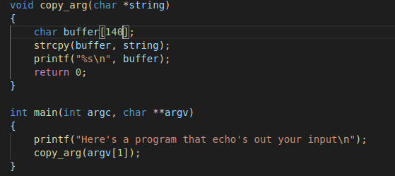 In this example, in the copy_arg function we can see that the strcpy function is copying input from a string(which is argv[1] which is a command line argument) to a buffer of length 140 bytes. With the nature of strcpy, it does not check the length of the data being input so here it’s also possible to overflow the buffer - we can do something more malicious here.