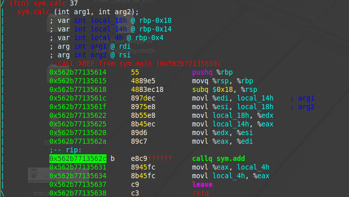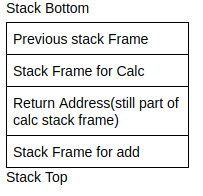 The explanation assumes that the current point of execution is inside the calc function. In this case calc is known as the caller function and add is known as the callee function. The following presents the assembly code inside the calc function