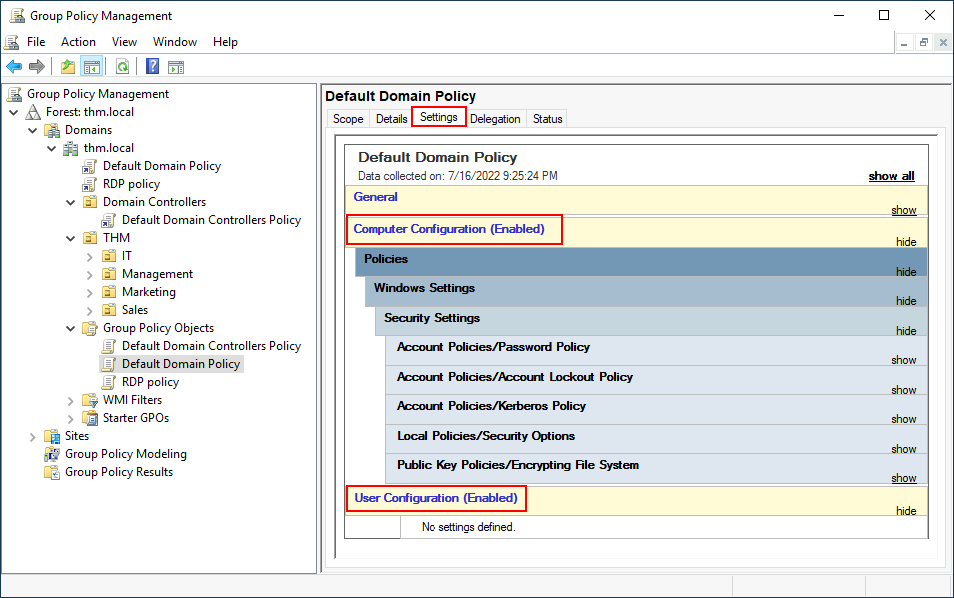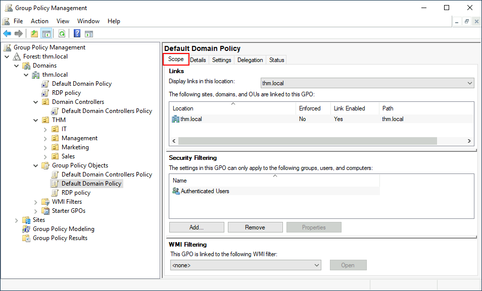 Let’s examine the Default Domain Policy to see what’s inside a GPO. The first tab you’ll see when selecting a GPO shows its scope, which is where the GPO is linked in the AD. For the current policy, we can see that it has only been linked to the thm.local domain: