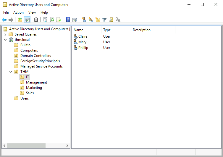 Checking our machine, we can see that there is already an OU called THM with four child OUs for the IT, Management, Marketing and Sales departments. It is very typical to see the OUs mimic the business’ structure, as it allows for efficiently deploying baseline policies that apply to entire departments. Remember that while this would be the expected model most of the time, you can define OUs arbitrarily. Feel free to right-click the THM OU and create a new OU under it called Students just for the fun of it.