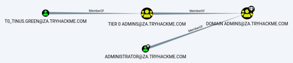The icons are called nodes, and the lines are called edges. Let’s take a deeper dive into what Bloodhound is showing us. There is an AD user account with the username of T0_TINUS.GREEN, that is a member of the group Tier 0 ADMINS. But, this group is a nested group into the DOMAIN ADMINS group, meaning all users that are part of the Tier 0 ADMINS group are effectively DAs.