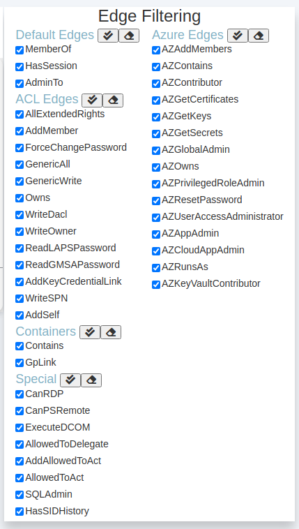 Each AD object that was discussed in the previous tasks can be a node in Bloodhound, and each will have a different icon depicting the type of object it is. If we want to formulate an attack path, we need to look at the available edges between the current position and privileges we have and where we want to go. Bloodhound has various available edges that can be accessed by the filter icon: